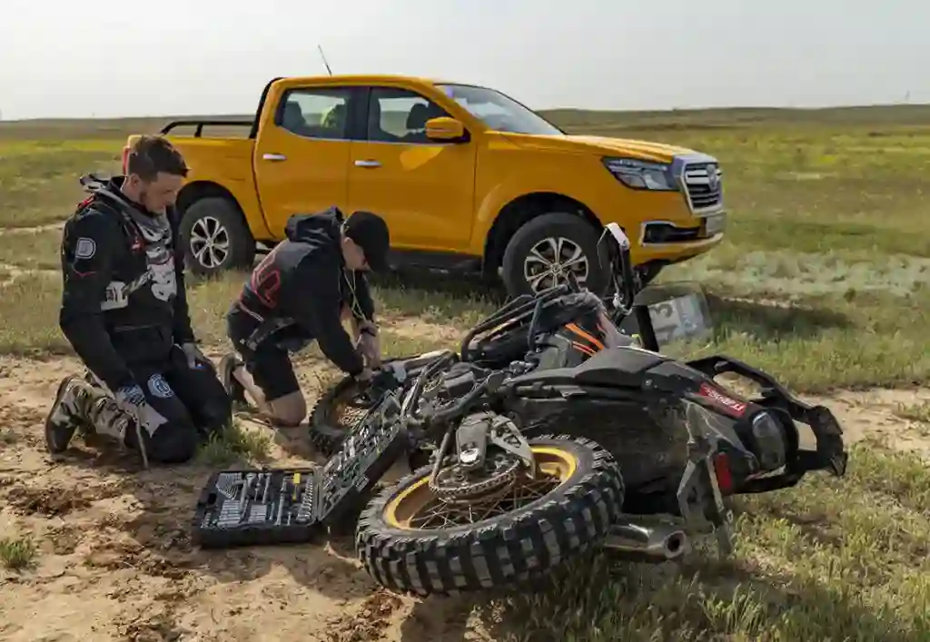 Первые 50 км, по словам мотоциклистов, оказались особенно сложными — на «рваной» жесткой трассе руки забивались как на мотокроссе. Затем начались песчаные прямики, требовавшие хорошей скорости, и гонщики наконец-то смогли открыть газ. К сожалению, когда на одном из GR 500 лопнула шина, до финиша оставалось еще почти 200 км: пришлось ждать механиков с новой покрышкой, однако больше никаких неприятностей не произошло, и до финиша второго спецучастка байки доехали.